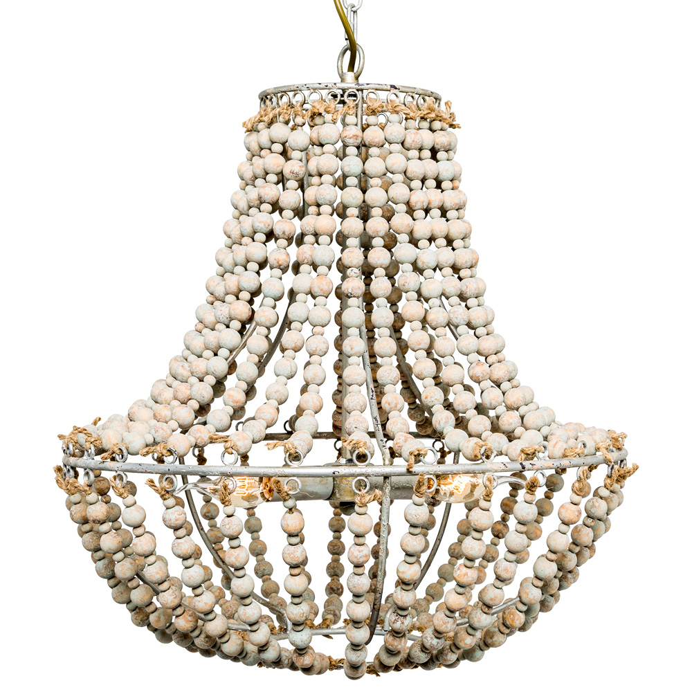 Размер: Ø 50,5 см, высота 51,5 см (без учета длины подвесной цепи) Длина подвесной цепи: приблизительно 1,5 м, регулируется согласно планировке владельца Количество ламп: 3 Тип электрических ламп: E14 Продается без ламп Материалы: каркас - металл, гирлянды - натуральное дерево Цвет: светлый бежевый, с эффектом патины Размер в упаковке: 56×56×58 см Вес: 4 кг, вес в упаковке: 6,2 кг