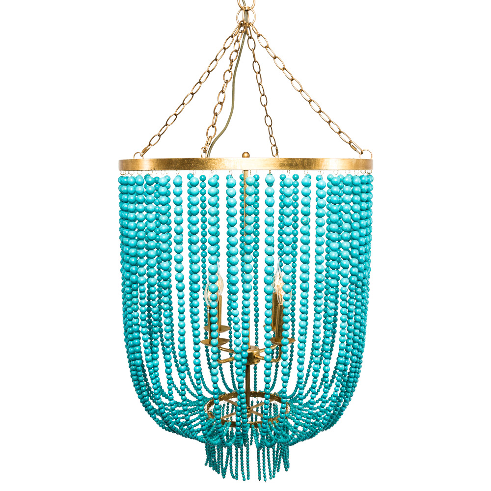 Размер: Ø 61 см, высота 117 см (без учета длины подвесной цепи) Длина подвесной цепи: приблизительно 1,5 м, регулируется согласно планировке владельца Количество ламп: 4 Тип электрической лампы: E14 Продается без ламп Материалы: металл, синтетическая бирюза Цвет: каркас - золотой, гирлянды - бирюзовый Размер в упаковке: 70×70×71 см Вес: 15 кг, вес в упаковке: 19,2 кг
