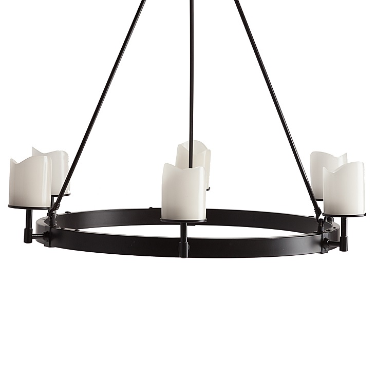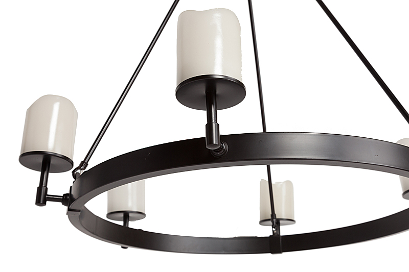 Люстра Velada. Довольно крупная потолочная люстра VELADA будет отлично сочетаться с каменной отделкой в помещении, старинными предметами, оружием, декоративными шкурами и головами животных. Люстра изготовлена из прочного металла, у нее круглое основание, соединяющееся с основной частью в виде кольца, дополненного шестью рожками. Последние сделаны из прочного огнеупорного пластика АБС, напоминающие свечи. Люстра отлично поддержит средневековую тематику помещений будь то городских квартир, загородного дома или ресторана. Предназначена для использования со светодиодными лампами.